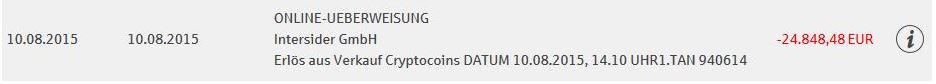 Abgezogen werden muss eingebrachtes E-Geld (Bitcoins und Ripple) 24.848 € am 10.08.2015 (Ankauf von der Intersider GmbH)
